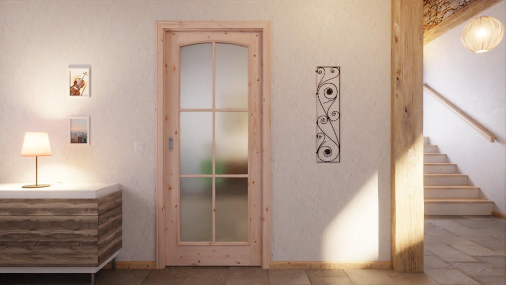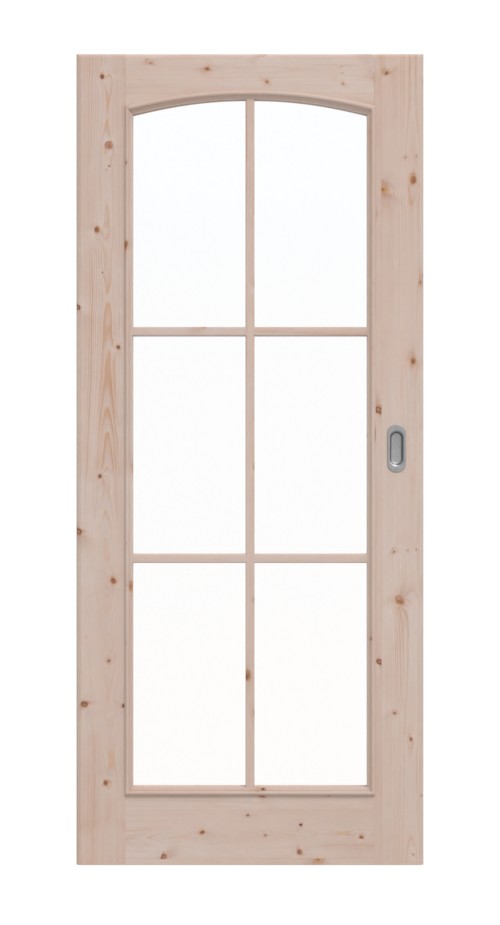 Dzięki dużemu przeszkleniu z eleganckim łukiem segmentowym i ramą z przegrodami do pomieszczenia wpada przyjemne światło. Ozdobne listwy szklane i szerokie fryzy dopełniają klasyczny design. Rustykalny urok drewna świerkowego jest w dużej mierze kształtowany przez jego wyraziste ramy z sękami.
