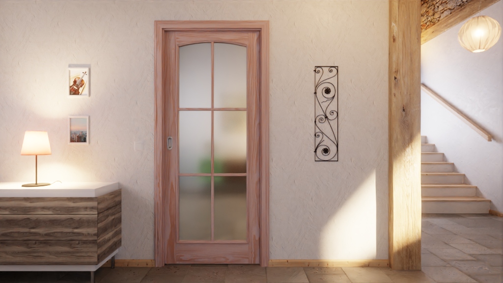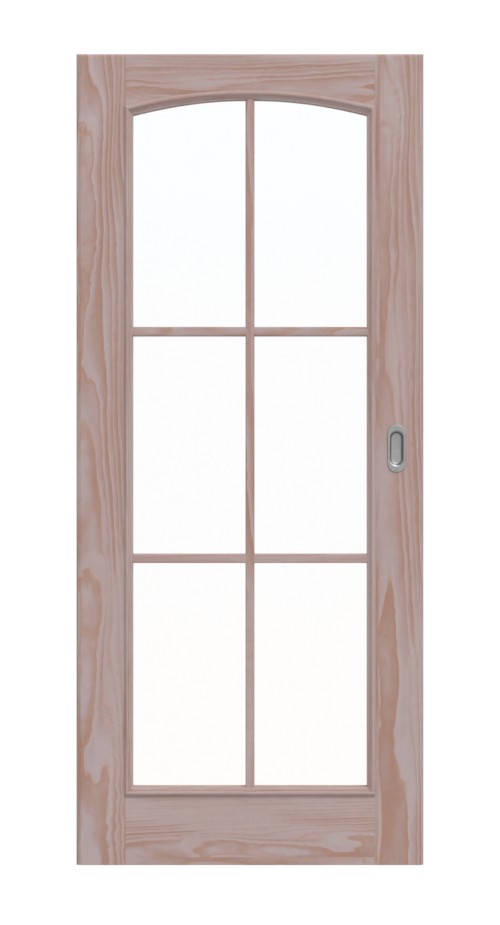 Dzięki dużemu przeszkleniu z eleganckim łukiem segmentowym i ramą z przegrodami do pomieszczenia wpada przyjemne światło. Ozdobne listwy szklane i szerokie fryzy dopełniają klasyczny design. W świerkowym drewnie bez sęków widoczne są żywe usłojenia.