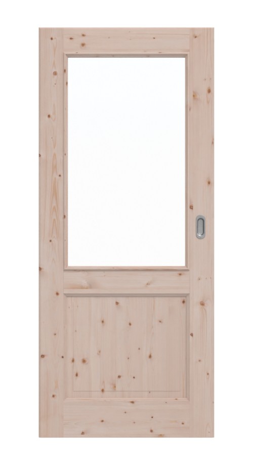 Otoczone szerokimi, ozdobnymi fryzami, profilowane wypełnienie z litego drewna oraz okno świetlne otoczone listwami szklanymi nadają drzwiom klasyczny wygląd. Na drewno sosnowe wyraźnie rysują się żywe ramy sęków, co nadaje mu rustykalny charakter.