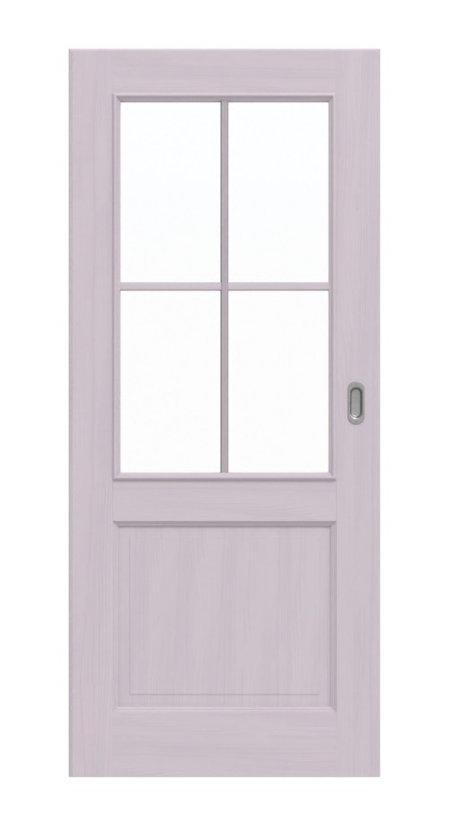 Eleganckie szprosy i listwy szklane zdobią świetlik w górnej części skrzydła drzwi. Poniżej znajduje się wykończona lite drewno wypełnienie, które harmonijnie akcentują ozdobne profile fryzowe. Delikatnie przebijają przez białą pigmentację sękate słoje świerka.