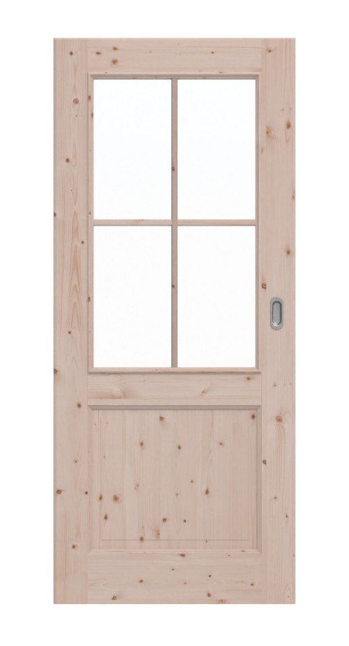 Harmonijnie łączą się świetlik z przegrodami i profilowane wypełnienie w klasycznym designie modelu. Piękne zdobienia listew szklanych i profili fryzowych dodają kolejnych akcentów. Rustykalny klimat drewna sosnowego jest w dużej mierze kształtowany przez jego wyraziste ramy.