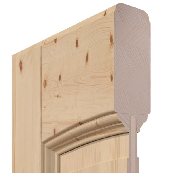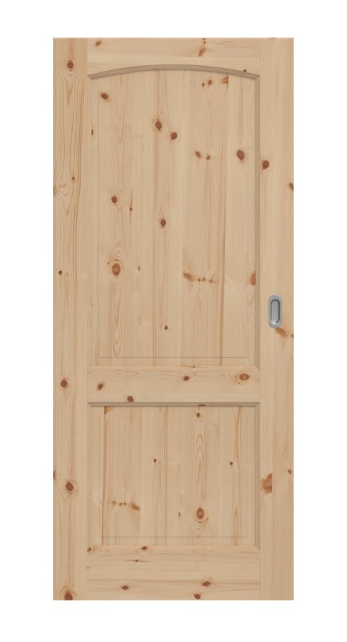 Dwóch odseparowanych wypełnień z prawdziwego drewna nadaje drzwiom klasyczny charakter. Eleganckie detale, takie jak łuk segmentowy i zdobione profile fryzowe, dodają dodatkowych akcentów. Wiejski urok drewna sosnowego jest w dużej mierze kształtowany przez wyraźne sęki.