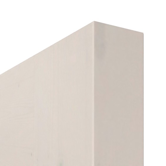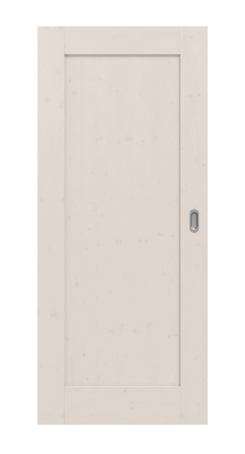 Szerokie listwy otaczają dużą wypełnioną część w środku skrzydła drzwi, co nadaje nowoczesny wygląd minimalistycznej klarowności. Naturalna słojowość świerka delikatnie ukazuje się wraz z sękami pod białą pigmentowaną powierzchnią.