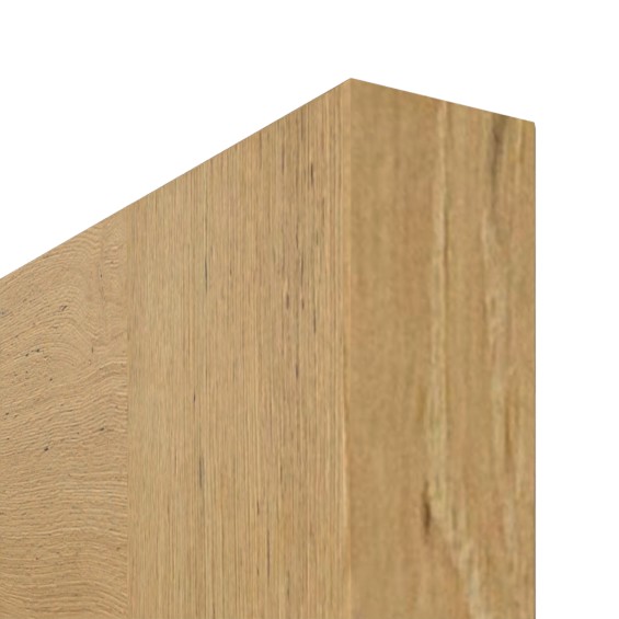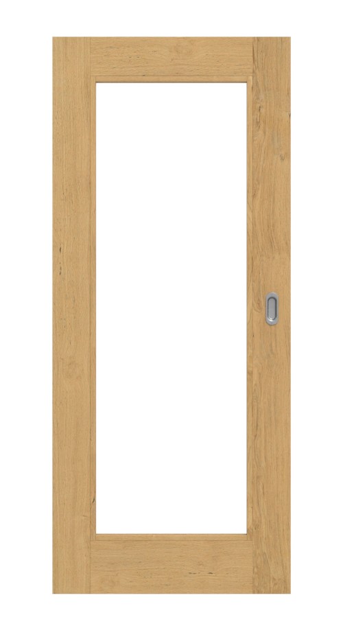 Drzwi wyróżniają się dużym przeszkleniem, otoczonym prostymi listwami szklanymi. Charakterystyczne słoje rozciągają się na ciepłym dębie, wprowadzając przytulną atmosferę do wnętrza.