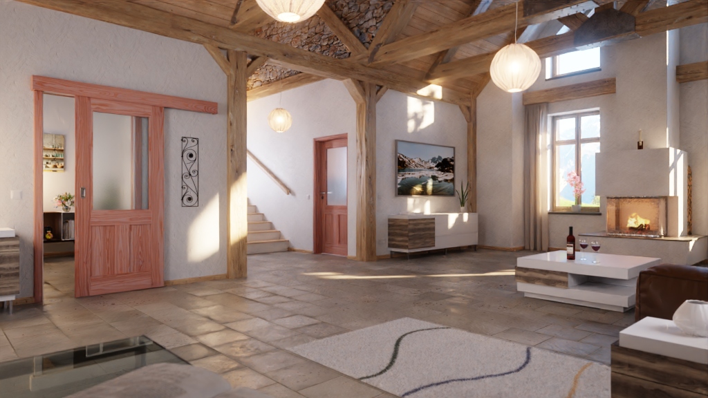 Wykusz świetlny, dwa mniejsze, płaskie wypełnienia z litego drewna oraz proste listwy szklane tworzą w tych drzwiach przesuwanych nowoczesny design z wyraźnymi liniami. Naturalne słoje rozciągają się na ciepłym drewnie modrzewiowym i wprowadzają przytulną atmosferę do pomieszczenia.