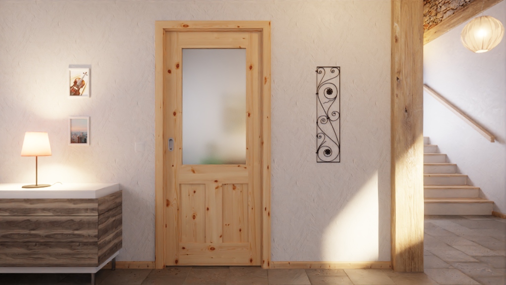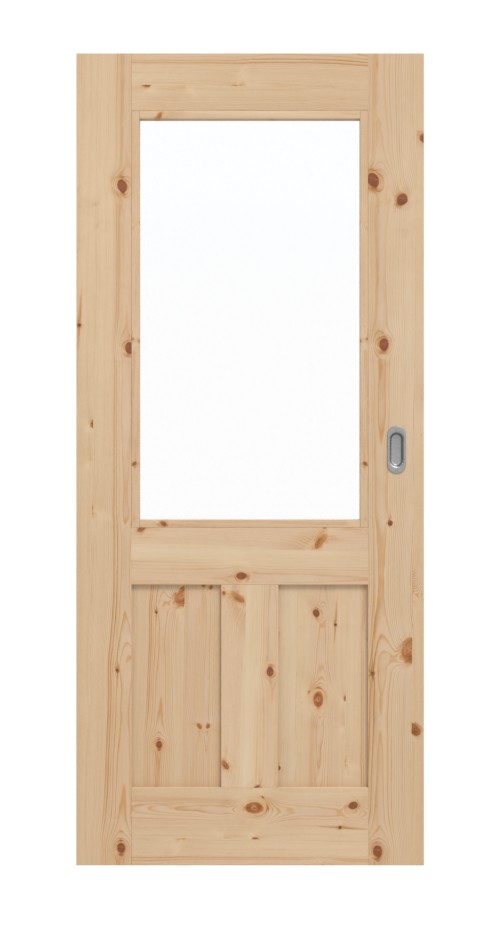 Wykusz świetlny, dwa mniejsze, płaskie wypełnienia z prawdziwego drewna i proste listwy szklane tworzą w tych drzwiach przesuwanych nowoczesny design z wyraźnymi liniami. Naturalnie uformowane słoje z ramkami z astygmatycznych sęków nadają rustykalny charakter drewna sosnowego.