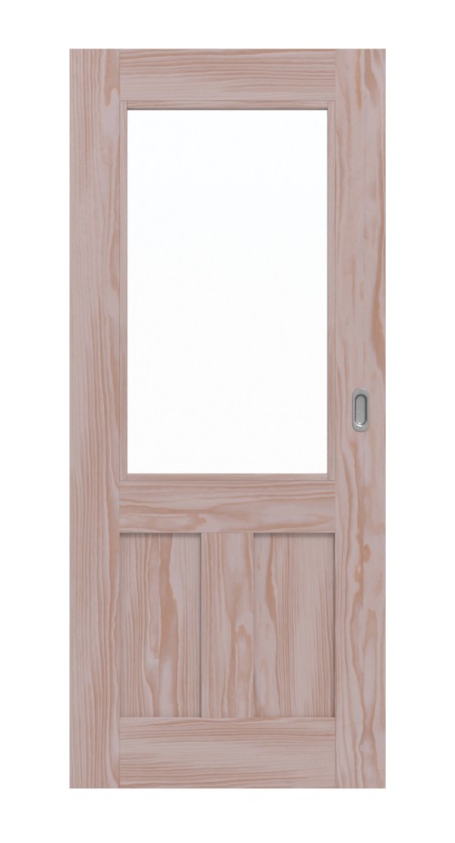 Wykusz świetlny, dwa mniejsze, płaskie wypełnienia z prawdziwego drewna oraz proste listwy szklane tworzą w tych drzwiach przesuwanych nowoczesny design z wyraźnymi liniami. Piękny i zawsze unikalny usłojenie zdobi świerkowe drewno bez sęków.