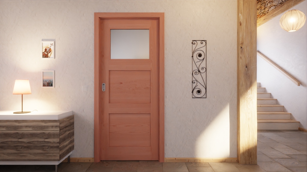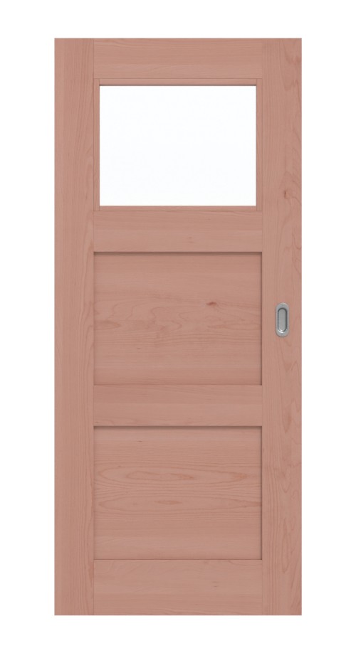 Nowoczesny design drzwi przesuwnych składa się z wydrążenia szklanego i dwóch płaskich wypełnień. Rysunek drewna, stworzony przez naturę, ozdabia drewno bukowe i tworzy ciepłą, przytulną atmosferę.