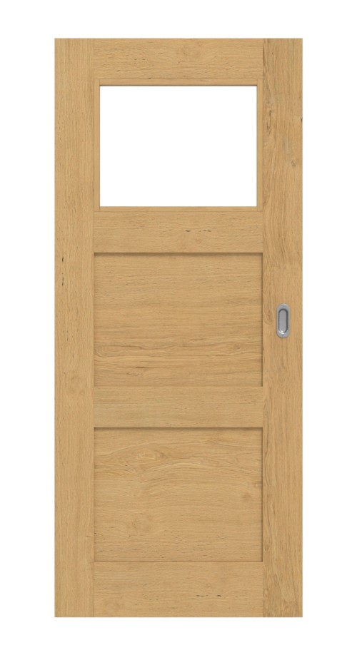 Wyraźne kontury dostarcza drzwi przesuwne z dwoma płaskimi wypełnieniami i prostokątnym oknem świetlnym. Charakterystyczne słoje rozciągają się na ciepłym dębie i wprowadzają przytulną atmosferę do pomieszczenia.