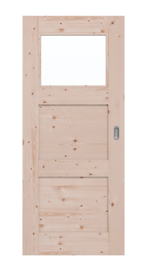 Współczesny design drzwi przesuwnych składa się z wkładki szklanej i dwóch płaskich wypełnień. Żywe usłojenie i wyraźne sęki nadają rustykalny charakter świerkowi.