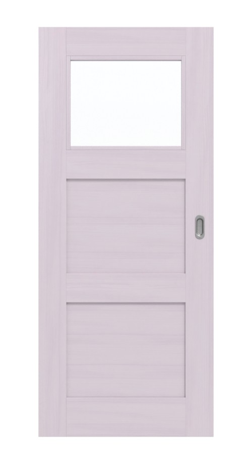 Nowoczesny design drzwi przesuwnych składa się z wydrążonego szkła i dwóch płaskich wypełnień. Drewno świerkowe bez sęków jest wzbogacone białą pigmentacją, pod którą delikatnie widoczne są słoje.