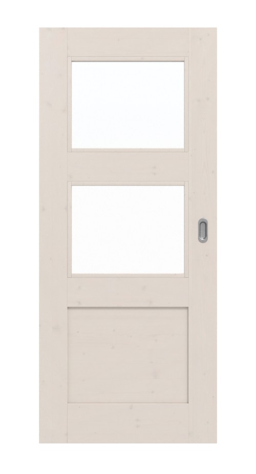 Nowoczesny design z dwoma przeszkleniami i wypełnieniem z litego drewna wyróżnia się wyraźnymi liniami. Pod białym pigmentowanym wykończeniem delikatnie ukazuje się słojowanie świerku.