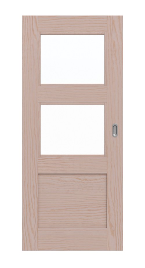 Nowoczesny design z dwoma przeszkleniami i wypełnieniem z prawdziwego drewna zachwyca swoją klarowną linią. Dzięki zawsze unikalnemu układowi słojów sosnowych każde drzwi zyskują indywidualny charakter.