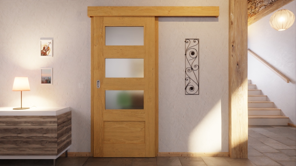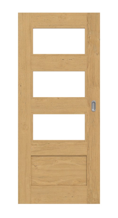 Trzy przeszklenia i wypełnienie z litego drewna układają się w liniowym designie tych drzwi przesuwnych. Przytulność zapewnia ciepłe drewno dębowe, ozdobione naturalną słojowością.