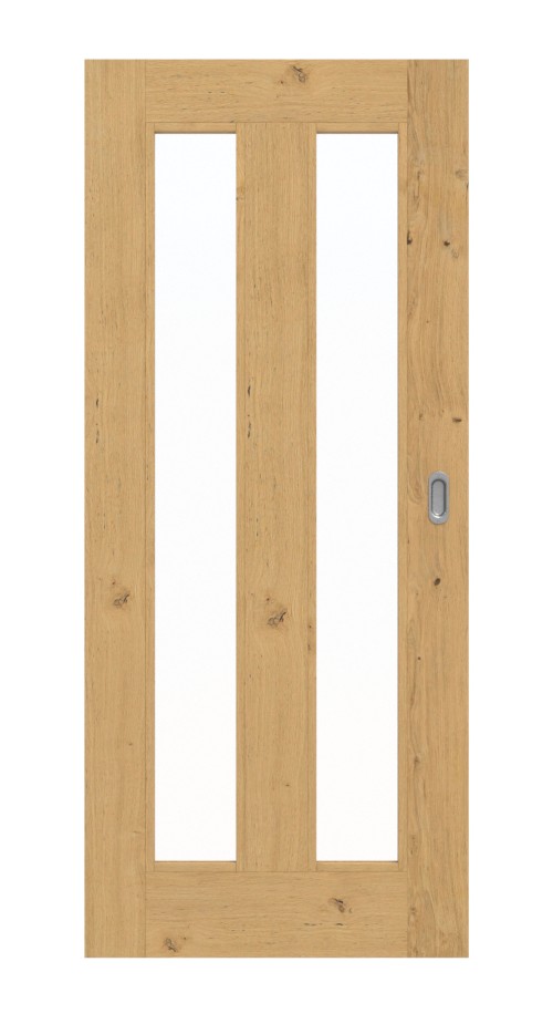 Dwa wąskie przeszklenia charakteryzują nowoczesny, minimalistyczny design. Żywe słojowanie z astenowymi ramkami przebiega przez dąb, nadając każdym drzwiom unikalny charakter.