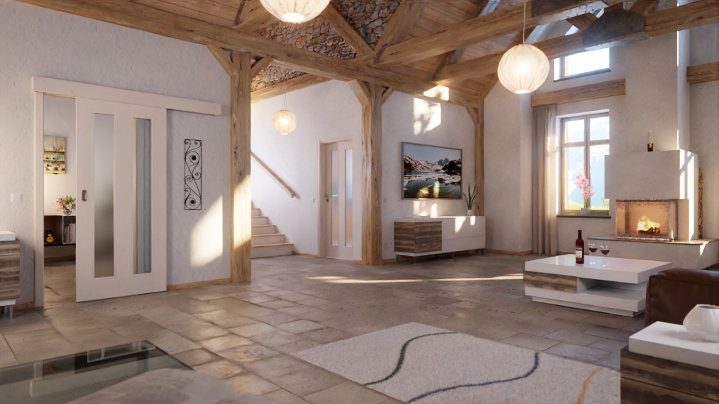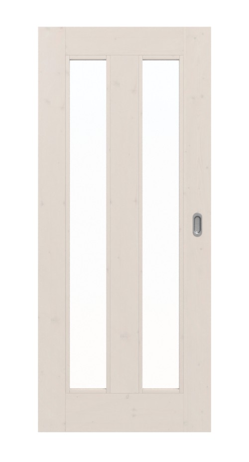Dwa wąskie przeszklenia charakteryzują bezpretensjonalny nowoczesny design. Pod białym pigmentem subtelnie rysuje się słojowanie świerka z gałęziami.