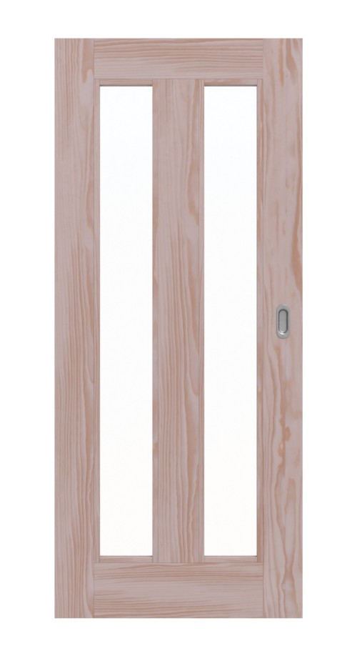Proste kontury, dwa przeszklenia i szerokie listwy tworzą nowoczesną estetykę. Piękny i zawsze unikalny układ słojów zdobi lite drewno sosnowe bez sęków.