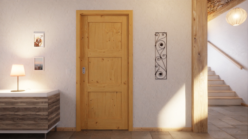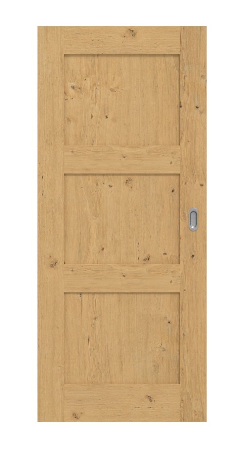 Szerokie listwy i trzy płaskie wypełnienia kształtują nowoczesny design drzwi przesuwnych. Wyraziste słoje z udziałem sęków nadają charakterystyczny wygląd dębowemu drewnu.