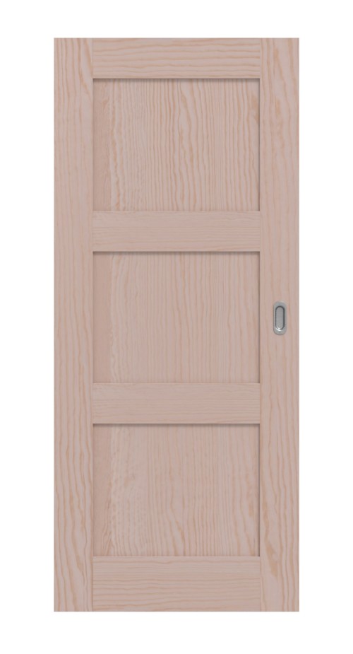 Trzy płaskie wypełnienia nadają drzwiom przesuwanym prostą klarowność. Dzięki zawsze unikalnemu przebiegowi słojów sosnowych każda drzwi zyskuje indywidualny charakter.