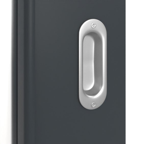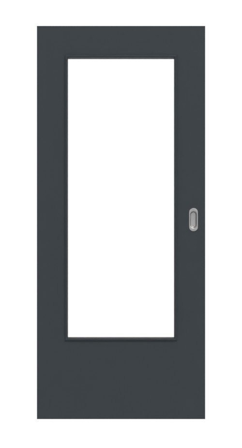 W ciemnym skrzydle drzwiowym umieszczono dużą powierzchnię szklaną, która nadaje pomieszczeniu przyjazny i otwarty charakter. Matowa powierzchnia zapewnia elegancki design, na którym nawet przy intensywnym użytkowaniu prawie nie pozostają odciski palców.