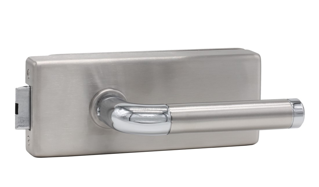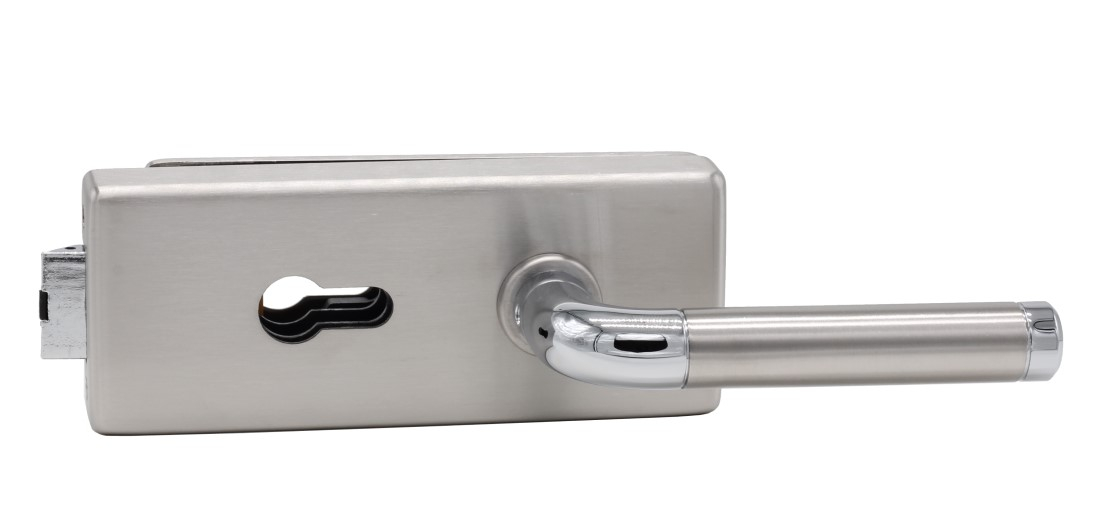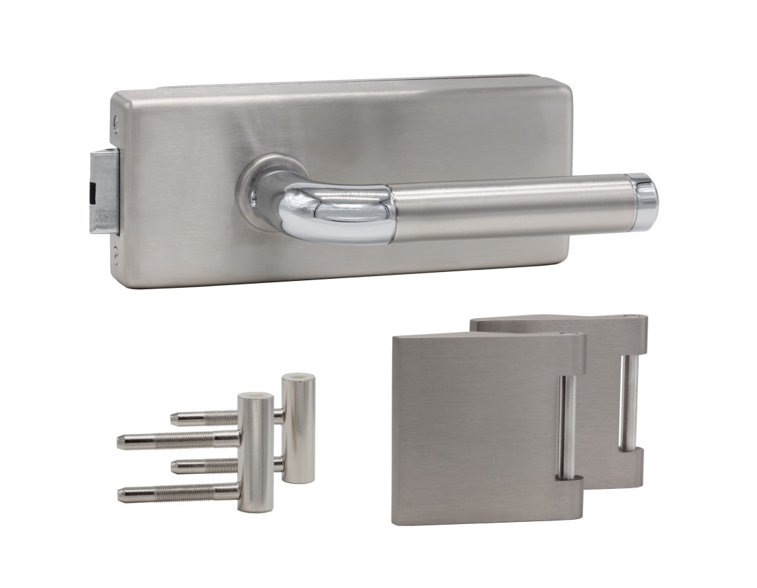 Zamek do drzwi szklanych Palma i klamka Sybille tworzą atrakcyjny zestaw firmy Südmetall .