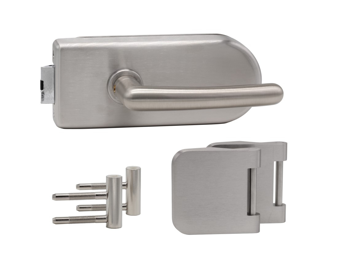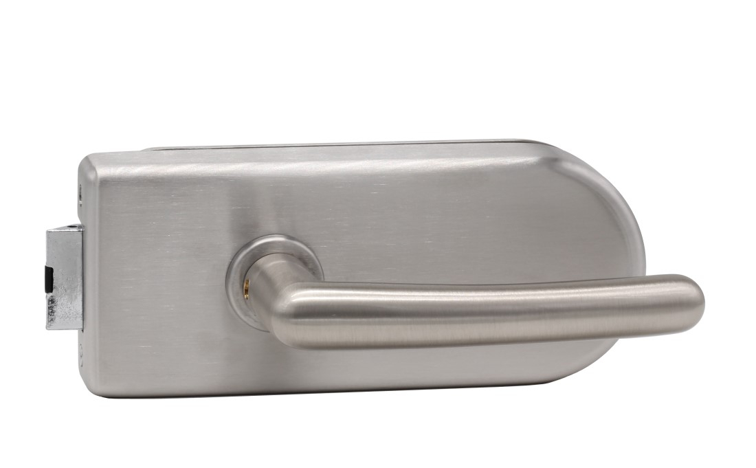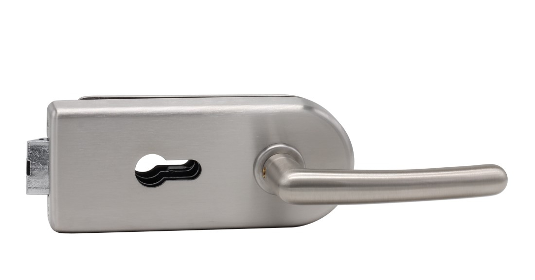 Połączenie zamka do drzwi szklanych Valencia i klamki Linda firmy Südmetall tworzy nowoczesne okucia do drzwi całkowicie szklanych.