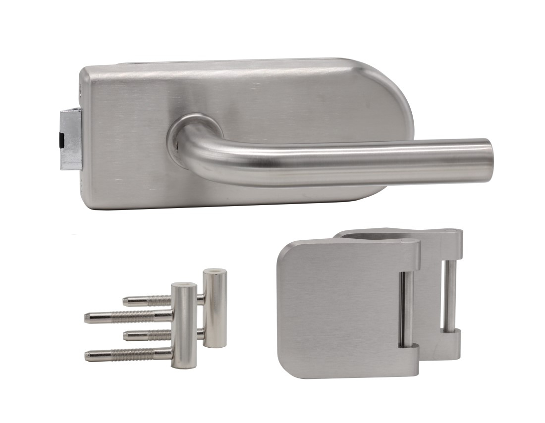 • Lieferumfang: 1x zamek do drzwi szklanych z cichą zapadką i nakrętką zaciskową, 1x para klamek, zawiasy w tym środkowa część zawiasu