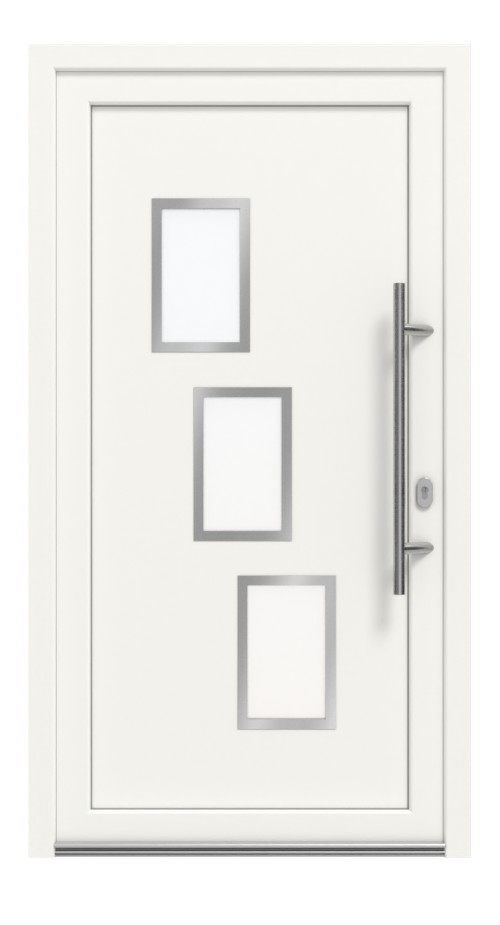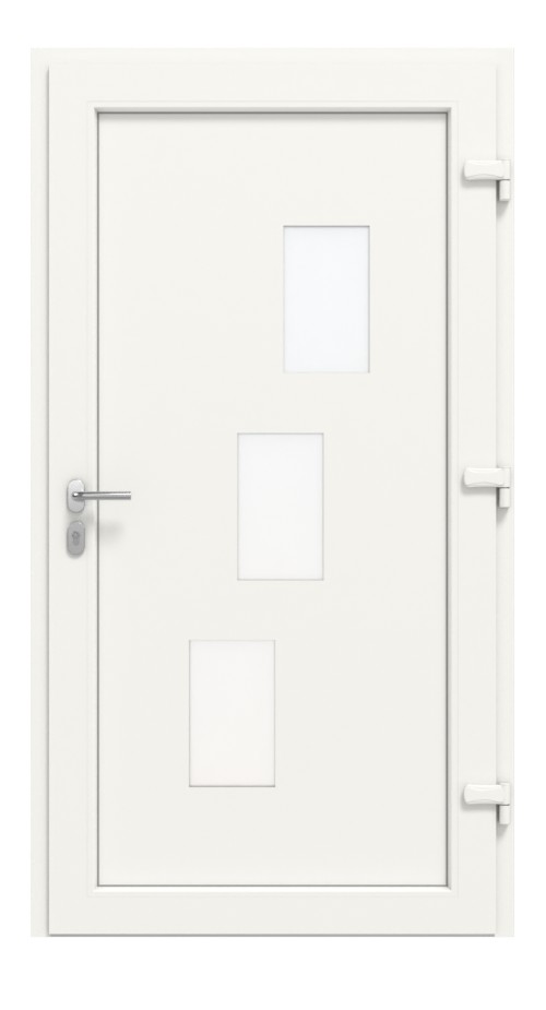 • Konstrukcja: izolowany termicznie profil wielokomorowy w ramie osłonowej i skrzydle z wyjątkowo odpornego na uderzenia PVC, skrzydło drzwiowe z wysoko izolującym wypełnieniem z tworzywa sztucznego typu sandwich z rdzeniem MDF 4 mm, grubość wypełnienia: 30 mm, uszczelki obwodowe