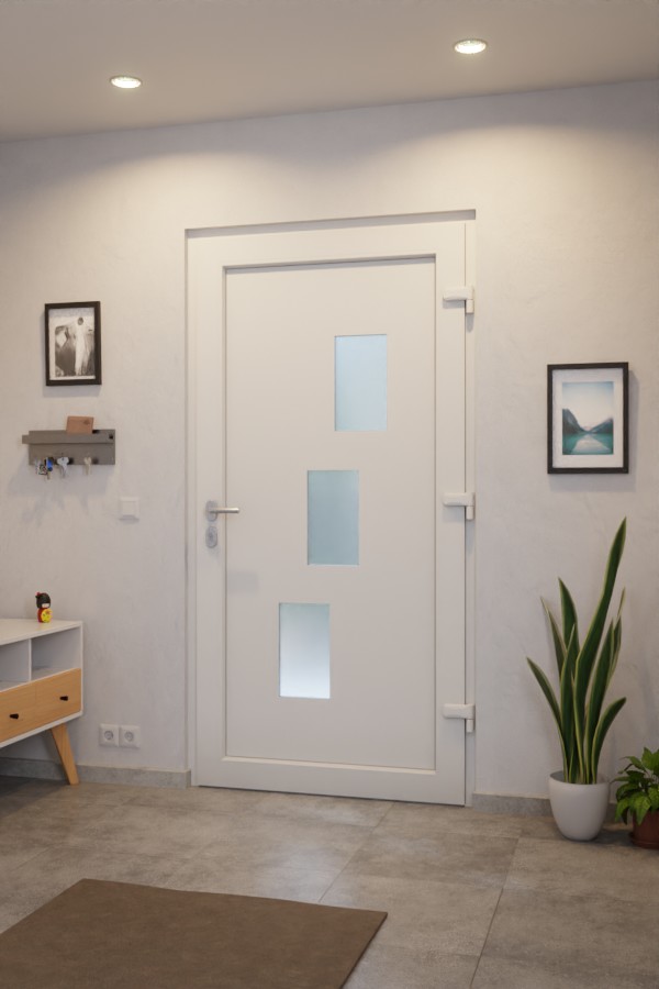• Zakres dostawy: Drzwi wejściowe z ramą osłonową, zawiasami, zamkiem, progą i osłoną przeciwdeszczową, inne elementy do konfiguracji
