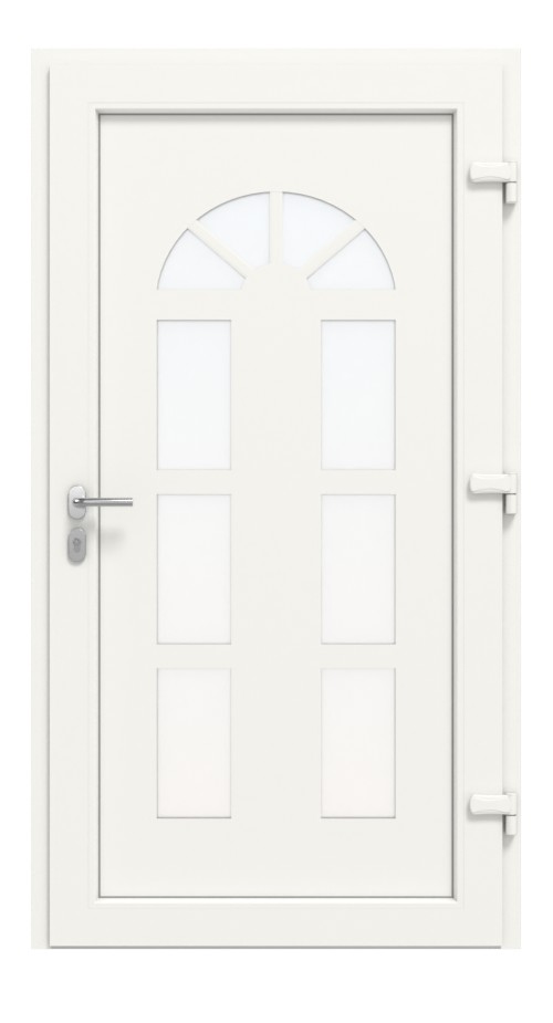 • Konstrukcja: izolowany termicznie profil wielokomorowy w ramie osłonowej i skrzydle z wyjątkowo odpornego na uderzenia PVC, skrzydło drzwiowe z wysoko izolującym wypełnieniem z tworzywa sztucznego typu sandwich z rdzeniem MDF 4 mm, grubość wypełnienia: 30 mm, uszczelki obwodowe