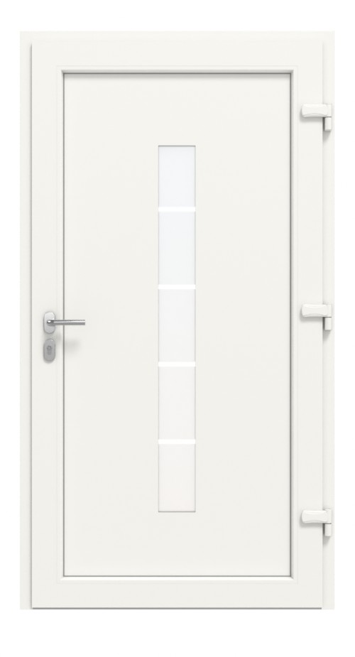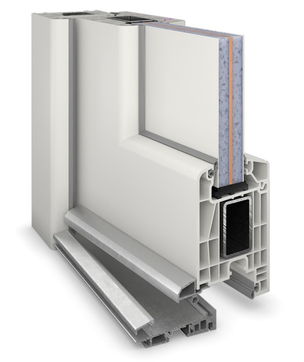 • Konstrukcja: izolowany termicznie profil wielokomorowy w ramie osłonowej i skrzydle z wyjątkowo odpornego na uderzenia PVC, skrzydło drzwiowe z wysoko izolującym wypełnieniem z tworzywa sztucznego typu sandwich z rdzeniem MDF 4 mm, grubość wypełnienia: 30 mm, uszczelki obwodowe
