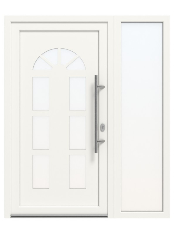 • Konstrukcja: wärmegedämmtes Mehrkammerprofil in Blendrahmen und Flügel aus extrem schlagzähem PVC, Türblatt mit dämmender Kunststoff-Sandwichfüllung mit 4 mm MDF-Kern, Füllungsstärke: 30 mm, umlaufende Dichtungen, Seitenteil mit Mehrkammerprofil und 2-fach Verglasung