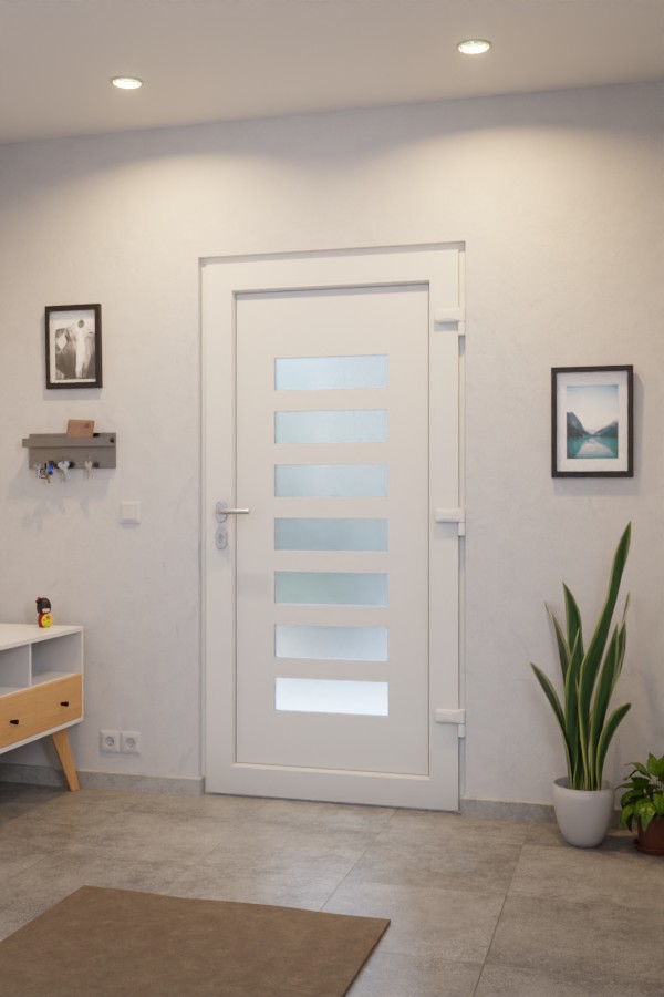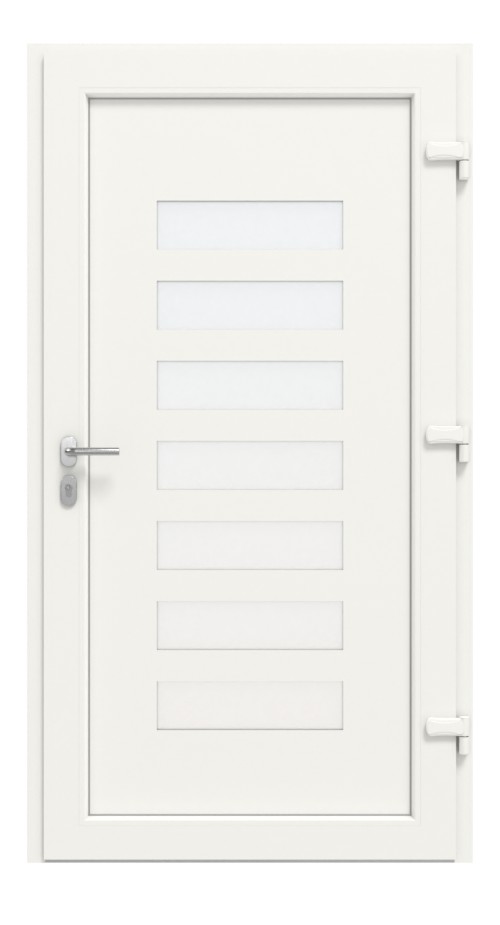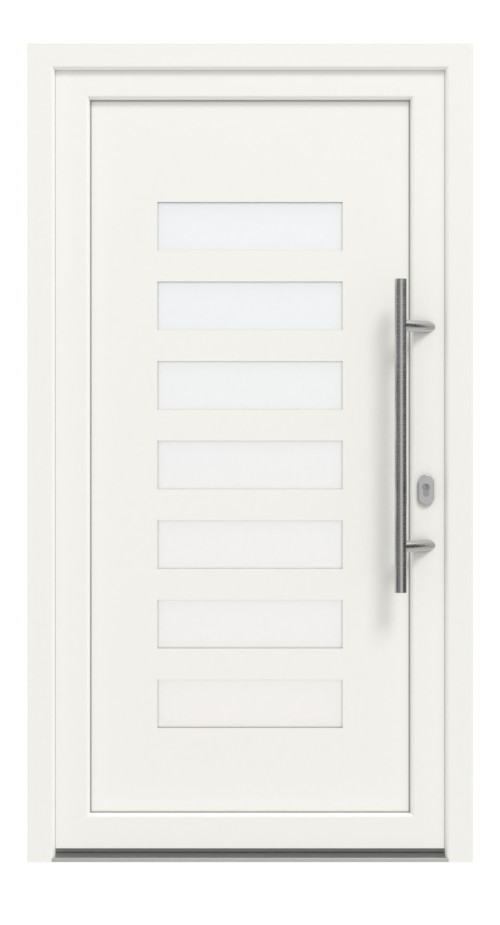 Nowoczesne drzwi zewnętrzne z PVC z siedmioma wąskimi szklanymi paskami.