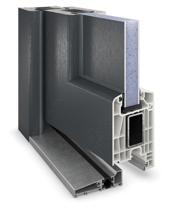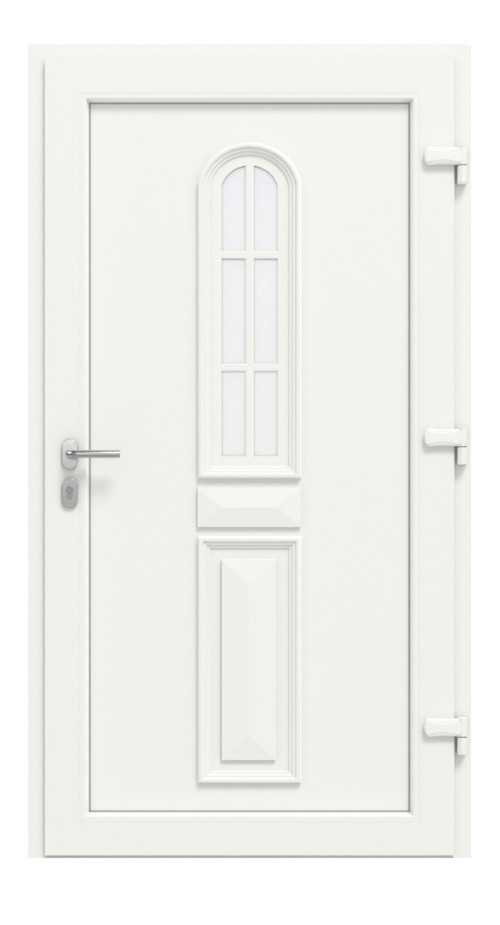 • Konstrukcja: izolowany termicznie profil wielokomorowy w ramie osłonowej i skrzydle z wyjątkowo odpornego na uderzenia PVC, skrzydło drzwiowe z wypełnieniem z tworzywa sztucznego, grubość wypełnienia: 24 mm, uszczelki obwodowe