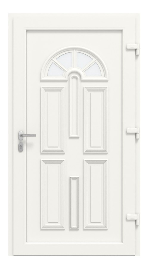 Klasyczne drzwi wejściowe z tworzywa sztucznego z profilowanymi detalami i trójwymiarowo regulowanymi zawiasami: