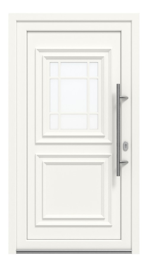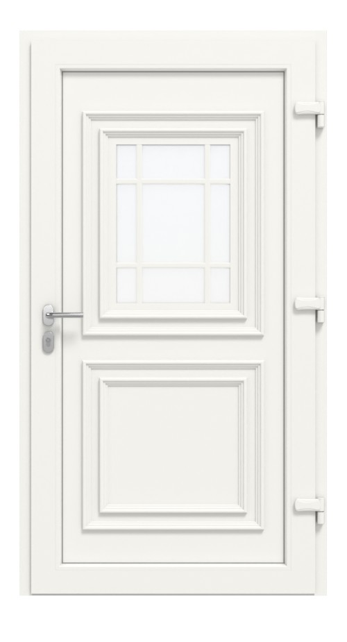 • Konstrukcja: izolowany termicznie profil wielokomorowy w ramie osłonowej i skrzydle z wyjątkowo odpornego na uderzenia PVC, skrzydło drzwiowe z wysoko izolującym wypełnieniem z tworzywa sztucznego typu sandwich z rdzeniem MDF 4 mm, grubość wypełnienia: 30 mm, uszczelki obwodowe