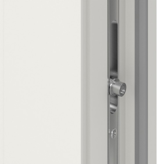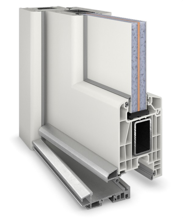 • Wielokomorowy profil PVC ze zintegrowanym wzmocnieniem stalowym w ramie osłonowej i skrzydle drzwiowym