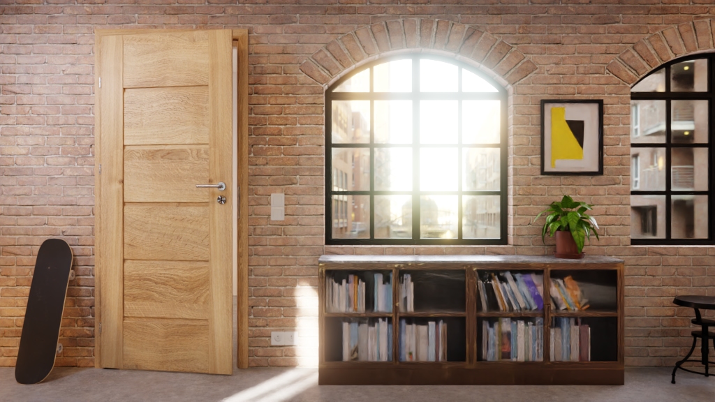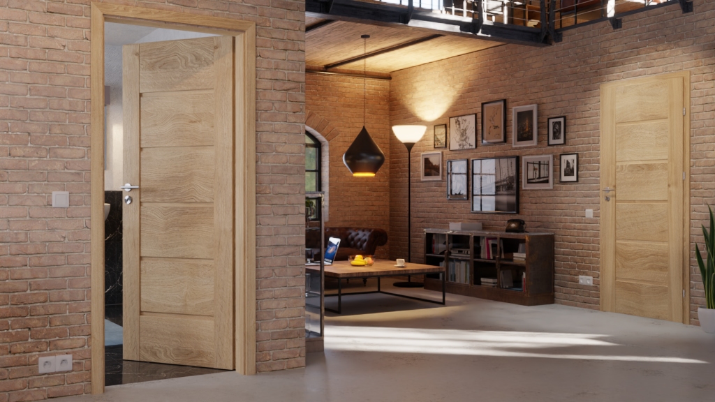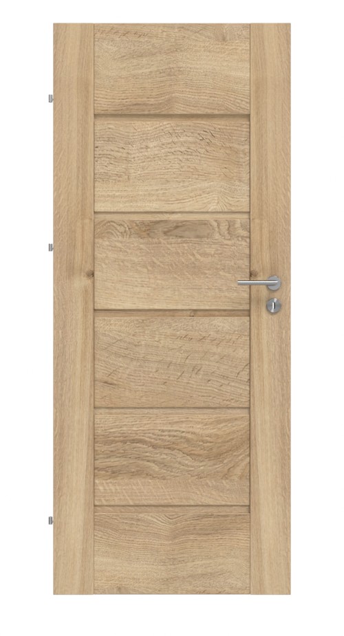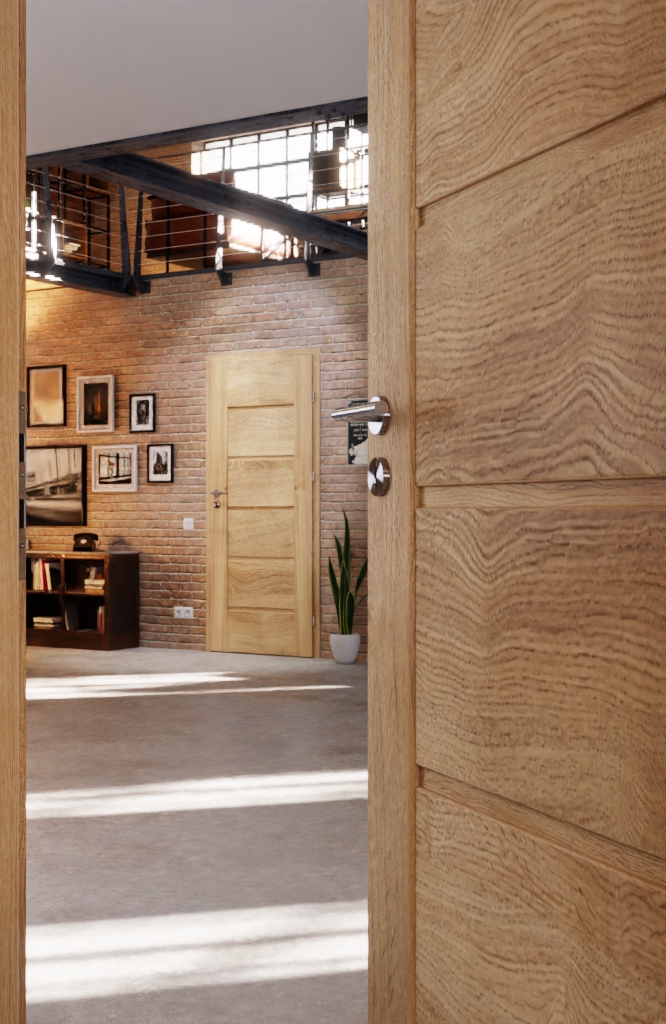 Proste frezowania dzielą skrzydło drzwi na kilka części, tworząc wyraźny, geometryczny design. Dzięki strukturze porów dekor dębowy zyskuje trójwymiarowy wygląd, przypominający forniry drewniane.