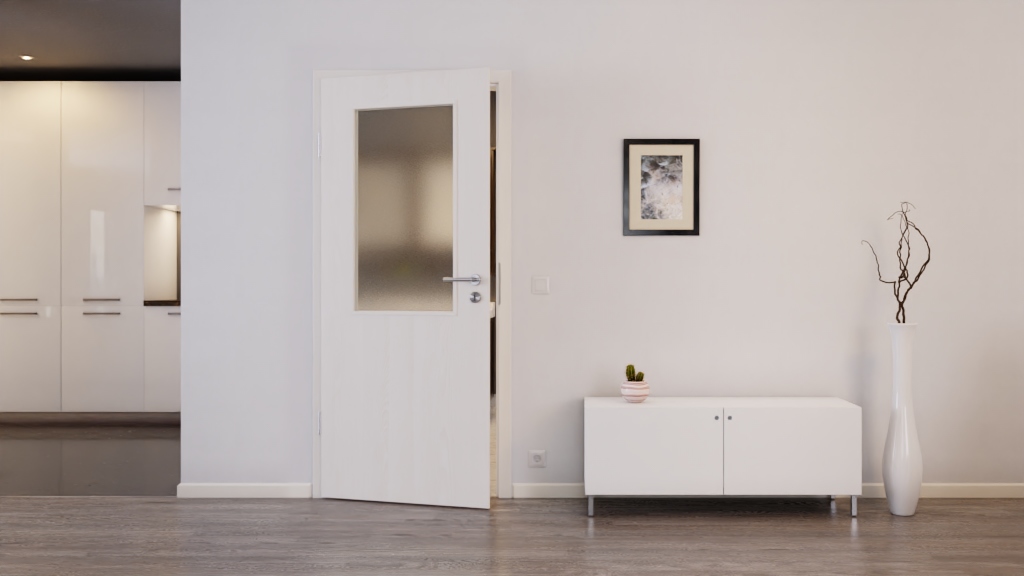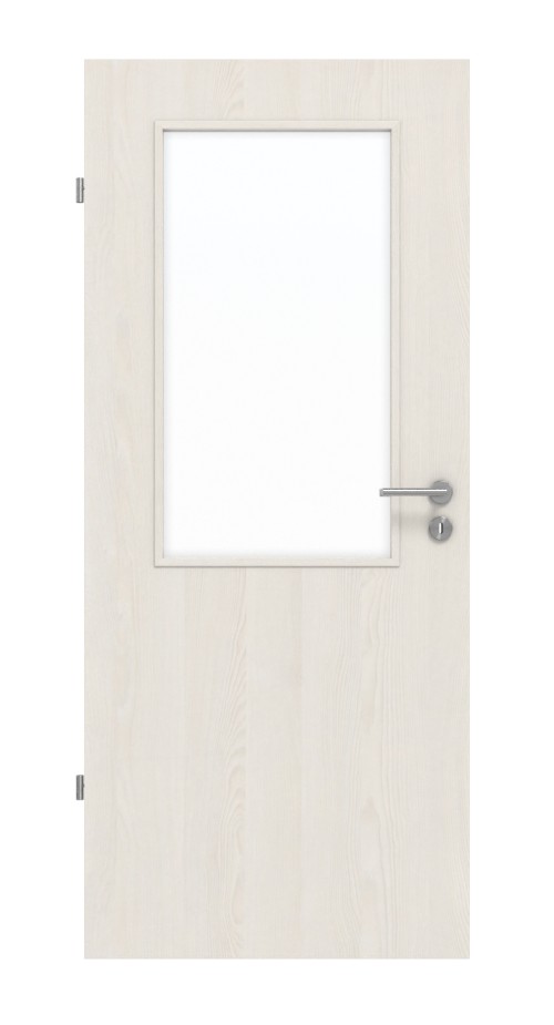 Powierzchnia białego jesionu jest subtelna i jednocześnie interesująca, ponieważ można dostrzec lekki, drewniany wzór. W górnej części skrzydła drzwi znajduje się centralne przeszklenie, które wpuszcza światło do pomieszczenia. Szklenie jest wliczone w cenę.