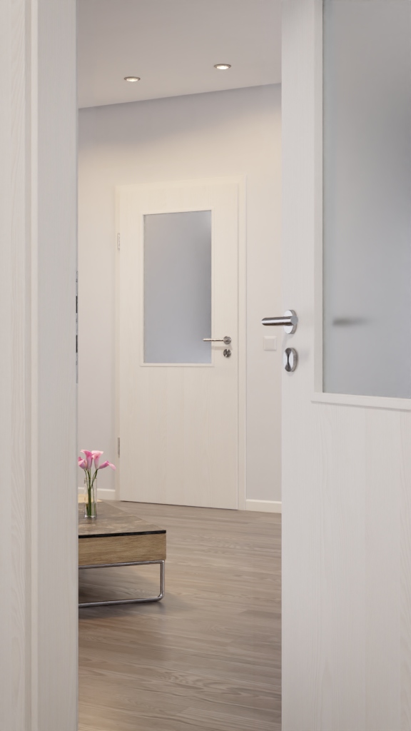 Folii dekoracyjnej otacza skrzydło drzwi. Dzięki temu drzwi nadają się do regularnego użytku w przestrzeni prywatnej. Dodatkowo skrzydło drzwi ma kanciastą krawędź, co podkreśla subtelną estetykę.