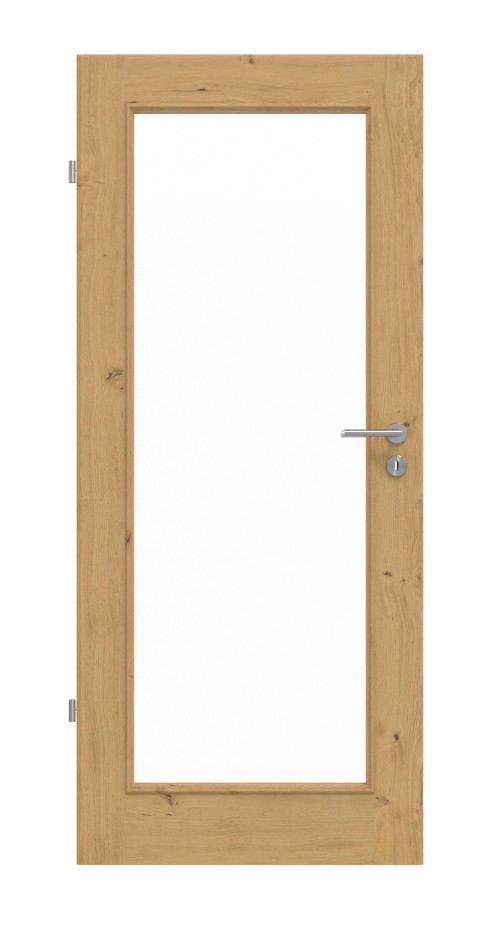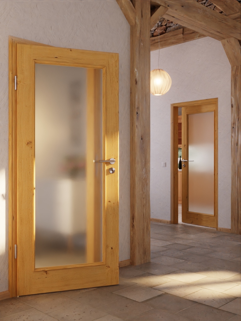 Duża szklenna wstawka pozwala na wpuszczenie dużo światła, co sprawia, że pokój staje się przyjemnie jasny. Otwór otoczony jest pięknie ozdobionymi listwami szklanymi i szerokimi fryzami. Drewno dębowe charakteryzuje się żywą strukturą z sękami, która w unikalny sposób odznacza się na każdym skrzydle drzwi.