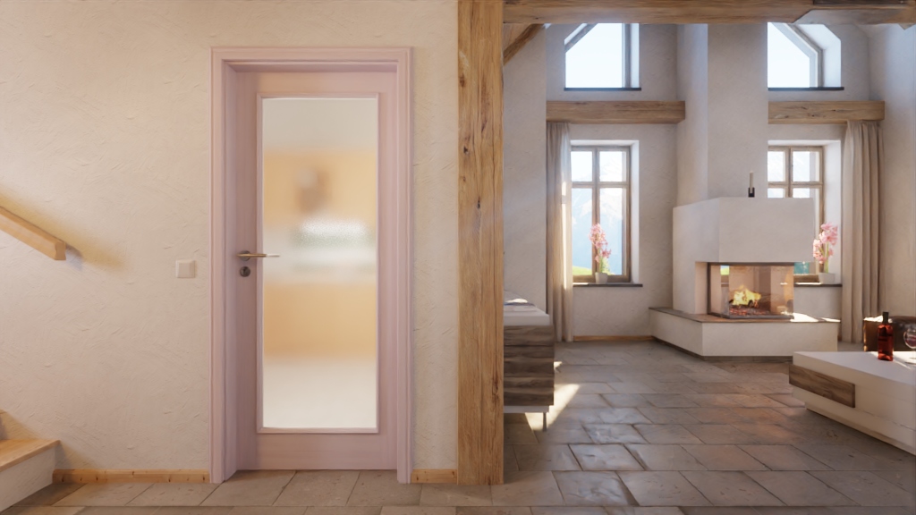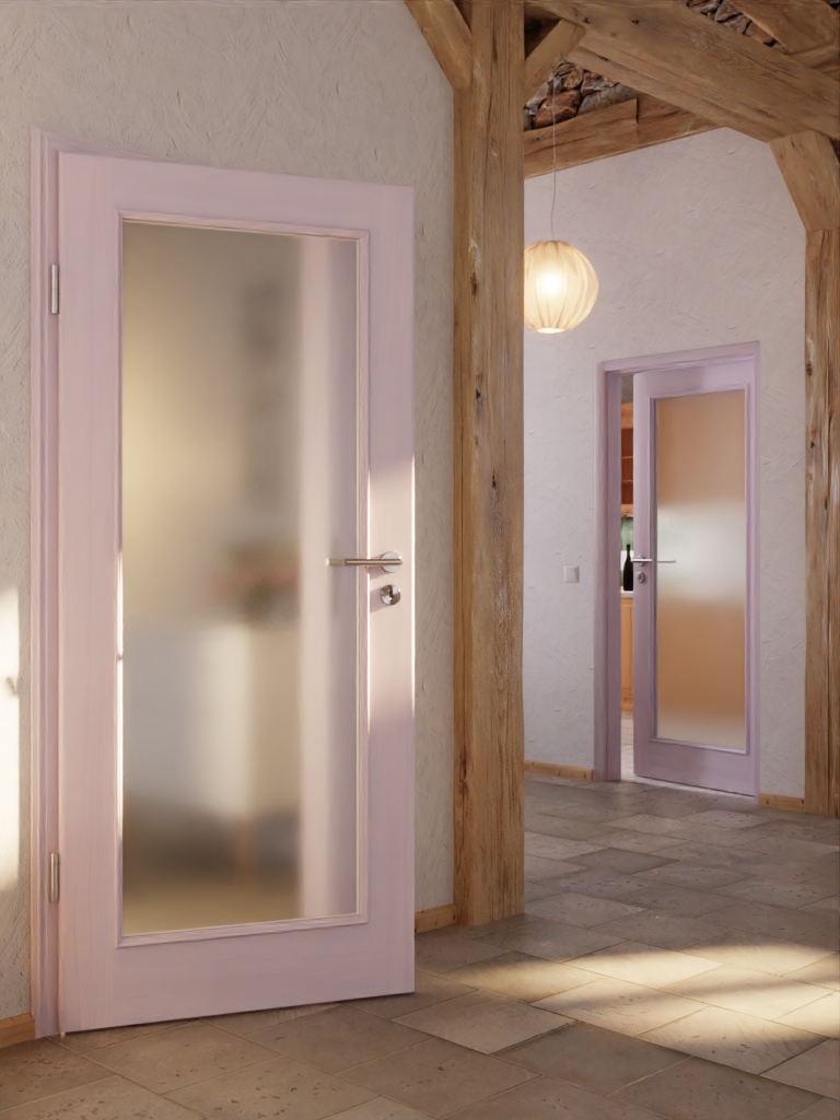Duży szklany wstawka wpuszcza dużo światła, rozjaśniając pokój. Otwór otoczony jest pięknie ozdobionymi listwami szklanymi i szerokimi fryzami. Dzięki białej pigmentowanej powierzchni delikatnie przebija słoje bezsękowego świerku.