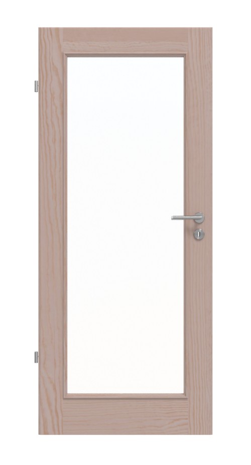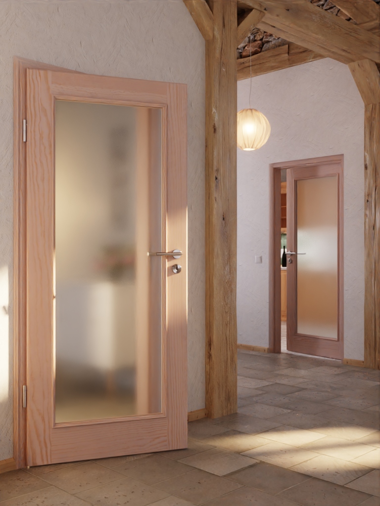 Dużo światła może wpadać przez duże przeszklenie, rozjaśniając pokój. Otwór otoczony jest pięknie ozdobionymi listwami szklanymi i szerokimi fryzami. Drewno sosnowe zdobi bezsęczna struktura, która na każdym skrzydle drzwi jest unikalna.