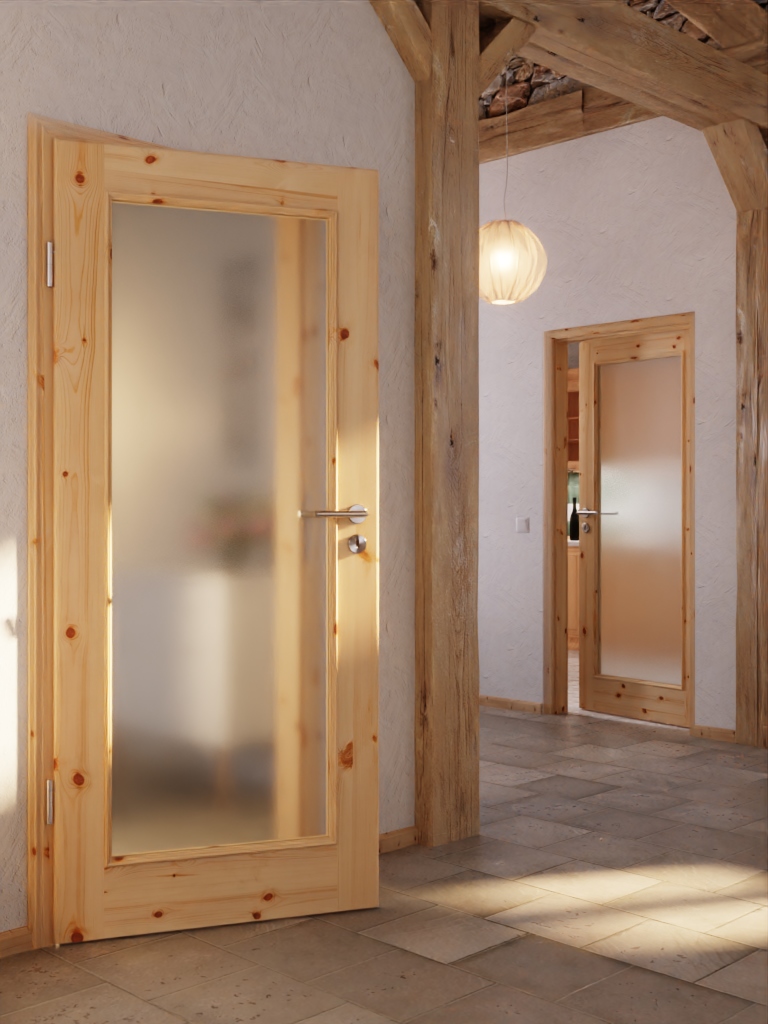 Szerokie fryzy i ozdobne listwy szklane elegancko otaczają duże przeszklenie. Rustykalny charakter drewna sosnowego jest w dużej mierze kształtowany przez wyraźne sęki.