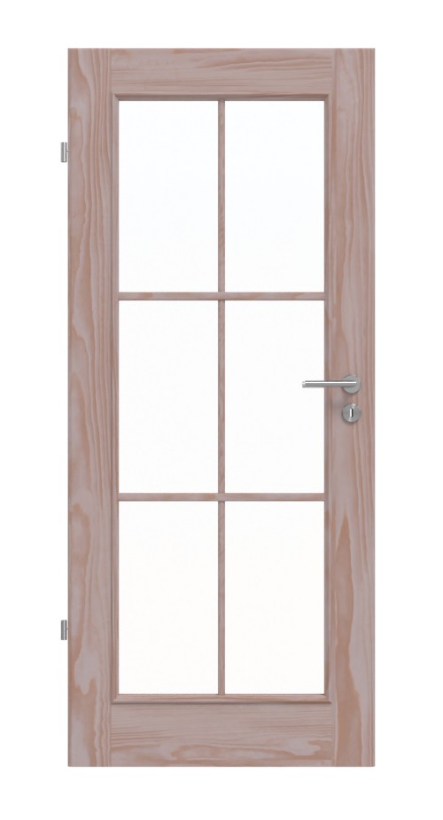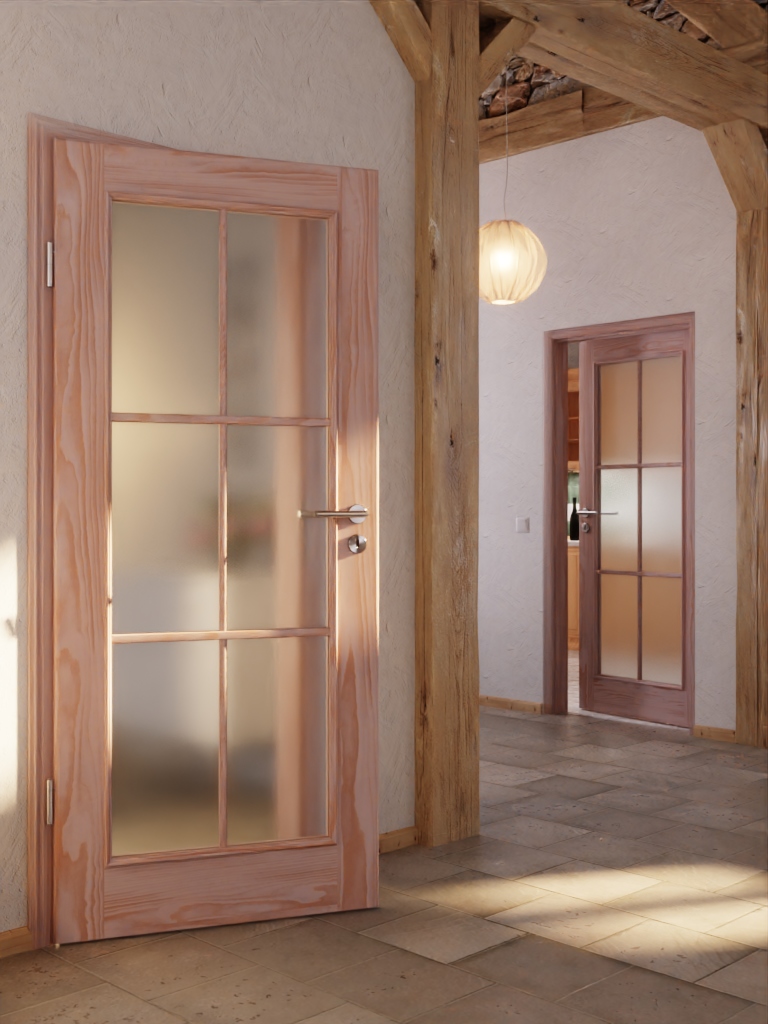 Ozdobione stylowymi szprosami i otoczone pięknie zdobionymi listwami szklanymi, obszerny przeszklenie stanowi urokliwy akcent. Dzięki zawsze indywidualnie przebiegającej strukturze drewna sosnowego każde skrzydło drzwi zyskuje unikalny charakter.