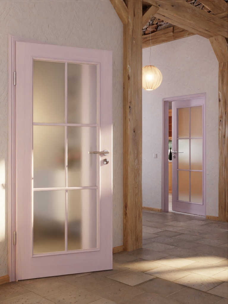 Eleganckie szprosy nadają klasyczny akcent w dużym świetliku, który jest stylowo otoczony ozdobnymi listwami szklanymi. Dzięki białej pigmentowanej powierzchni delikatnie przebija słoje sosny bezsęcznej.