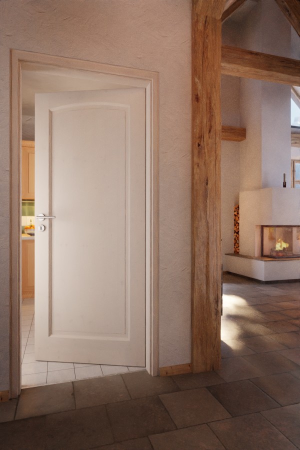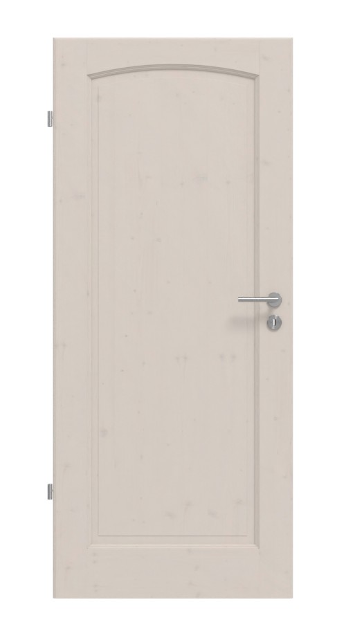 Wydzielona wypełnienie z łukiem segmentowym czyni drzwi klasycznym punktem przyciągającym wzrok. Również fryzy są elegancko profilowane i przyczyniają się do ponadczasowego wyglądu modelu. Dzięki białemu wykończeniu pigmentowemu delikatnie przebija słojowanie świerka.