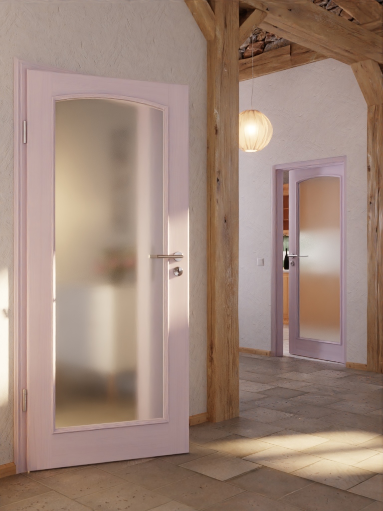 Dzięki dużemu otworowi na światło z eleganckim łukiem segmentowym do pomieszczenia wpada przyjazne światło. Ozdobne listwy szklane i szerokie fryzy dopełniają klasyczny design. Dzięki białej pigmencie powierzchni delikatnie przebija słoje bezsękowej jodły.