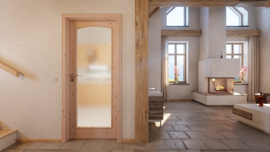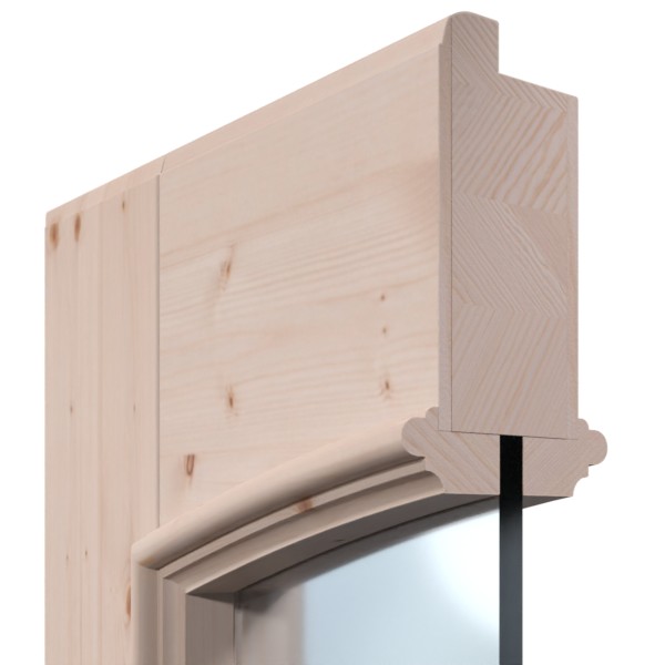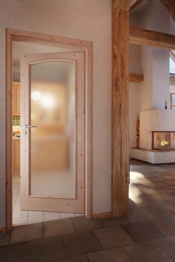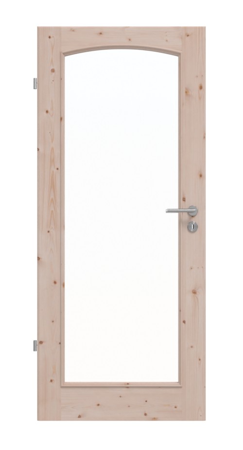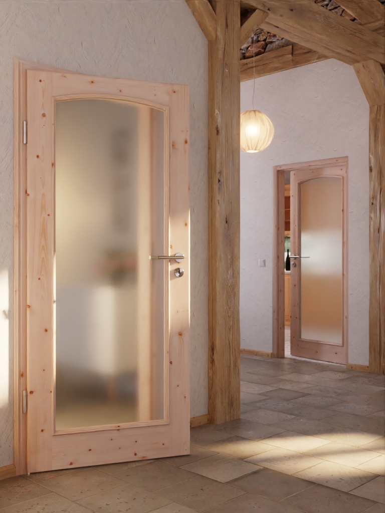 Dzięki dużemu otworowi na światło z eleganckim łukiem segmentowym do pomieszczenia wpada przyjazne światło. Ozdobne listwy szklane i szerokie fryzy dopełniają klasyczny design. Dynamika usłojenia zdobi drewno świerkowe i sprawia, że każde skrzydło drzwi jest unikalnym dziełem.