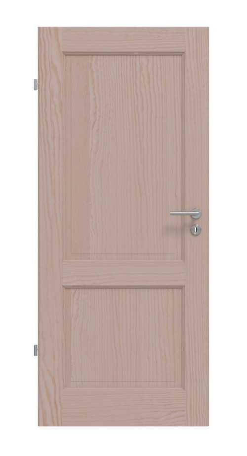 Dwie profilowane wypełnienia otoczone są ozdobnymi fryzami, co tworzy elegancki wygląd z wyraźnymi konturami. Bezsękowe usłojenie rozciąga się na drewno sosnowe i nadaje każdemu skrzydłu drzwi unikalny charakter.